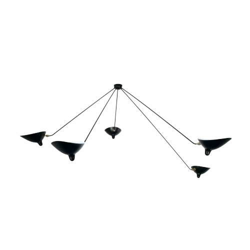 taklampa Spider med fem armar från 1953 balanserar funktion och konstnärlig frihet. Armarna i olika längder ger lampan ett livfullt, asymmetriskt uttryck, medan reflektorerna sprider ljuset med mjuk precision. Mässingsfogarna tillför värme och sofistikering, och i kombination med den svarta eller vita finishen skapar lampan ett grafiskt, tidlöst uttryck som berikar både moderna och klassiska utrymmen.